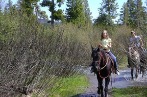 These rides are casual, gentle, and thoroughly enjoyed by riders of all ages, so bring everyone! Time is spent riding near the lakes and along the streams that flow down through from the mountains. We ride amidst the natural habitat of moose as well as nesting geese and ducks. You won't want to forget your camera because the scenery is beautiful. (2-hour ride includes horsemanship instruction as well as matching guests with horses.)
